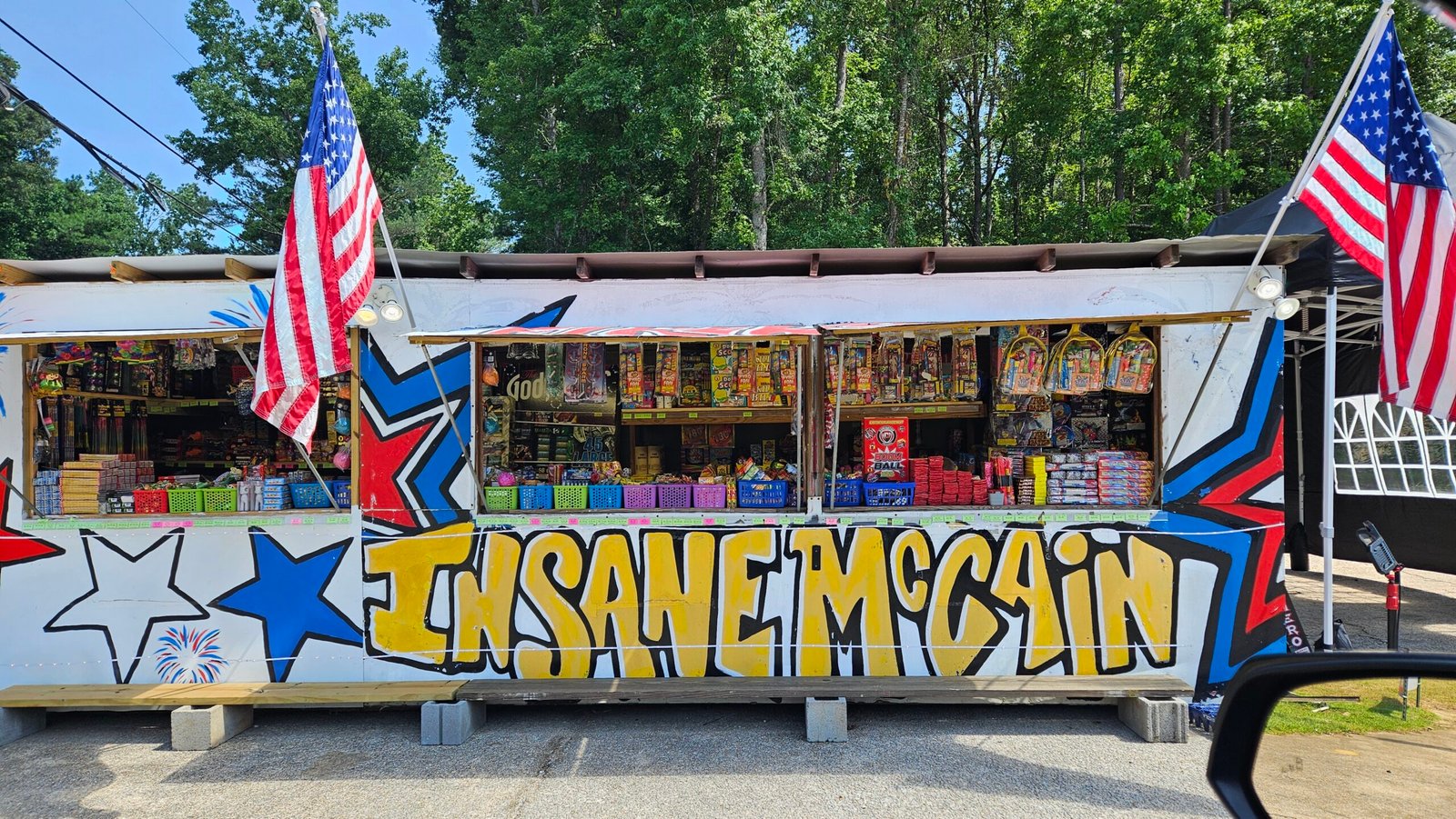 In 1989, Nira felt it was time for expansion. The second flap stand was opened in Parrish Alabama. Her youngest son, Michael, a senior at Walker High School helped his grandfather build a third stand which he opened in Manchester, a small community located in Jasper, Alabama. Over the next several years, Michael opened another located in Carbon Hill, Alabama. Now with 4 locations, all flap stands, Insane McCains Fireworks has truly begun.